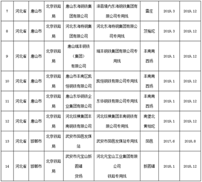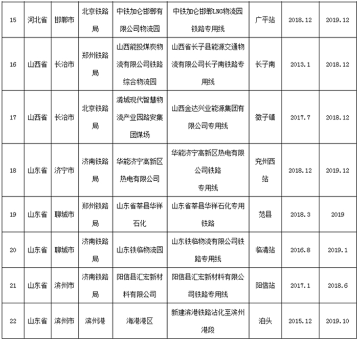 12.加快推進(jìn)鐵路專(zhuān)用線建設(shè)。各地要逐一核實(shí)《交通運(yùn)輸部等九部門(mén)貫徹落實(shí)國(guó)務(wù)院辦公廳〈推進(jìn)運(yùn)輸結(jié)構(gòu)調(diào)整三年行動(dòng)計(jì)劃(2018-2020)〉的通知》中鐵路專(zhuān)用線重點(diǎn)建設(shè)項(xiàng)目(見(jiàn)附件2)落實(shí)情況,按照《關(guān)于加快推進(jìn)鐵路專(zhuān)用線建設(shè)的指導(dǎo)意見(jiàn)》要求,積極推進(jìn)鐵路專(zhuān)用線建設(shè);2019年10月底前,各地要對(duì)大宗貨物年貨運(yùn)量150萬(wàn)噸及以上的大型工礦企業(yè)和新建物流園區(qū)鐵路專(zhuān)用線建設(shè)情況、企業(yè)環(huán)評(píng)批復(fù)要求建設(shè)鐵路專(zhuān)用線落實(shí)情況等進(jìn)行摸排。對(duì)工程進(jìn)度滯后的,要分析查找原因,分類(lèi)提出整改方案,確保2020年基本完成。若涉及規(guī)劃調(diào)整、項(xiàng)目變更、企業(yè)搬遷退出等因素不再建設(shè)的,地方可提出變更申請(qǐng),由主管部門(mén)確認(rèn)。