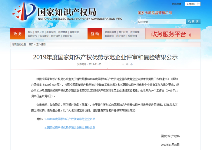國家知識產權示范企業是國家對企業知識產權創造、運用、保護、管理等方面工作突出授予的最高榮譽,也是國家給予企業知識產權管理工作的最高評價。通過評審的企業將作為地區知識產權發展的領頭羊,為知識產權發展提供有力支撐。