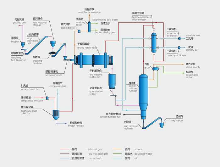 氣化灰渣經大傾角皮帶輸送至原料儲倉,經打散機破碎后送入干燥回轉窯中,干燥后灰渣送入保溫緩存倉,經高溫一次風定量吹送進入殘碳爐,與高溫二次風共同進行反應。